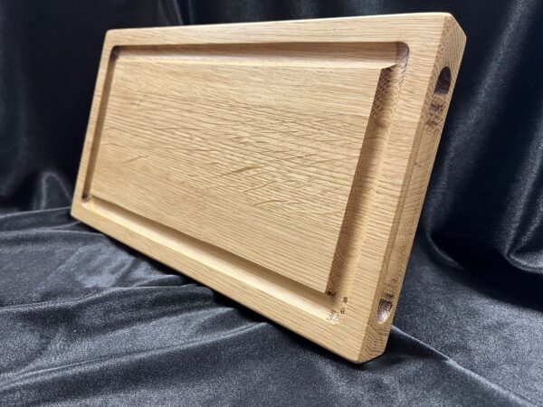Lõikelaud tammepuidust. Sisse freesitud vedelikusoontega. Mugavamaks kasutamiseks on laual freesitud käeavad. Viimistletud kvaliteetse lõikelaua õlivahaga, mis on vastavuses euronormidega ja ohutu toiduga kokkupuutes.